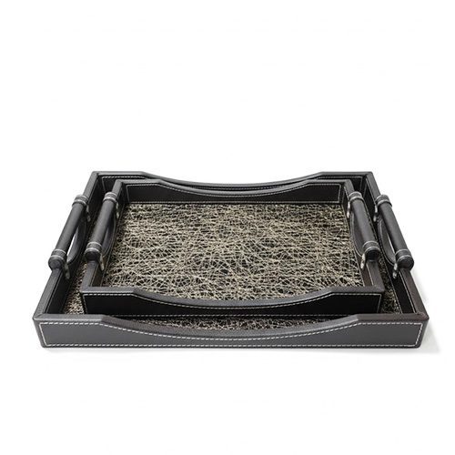 2737 Luxury Faux Leather 2-Piece Nesting Serving Tray Set Dark Brown with Shimmering Textured Interior