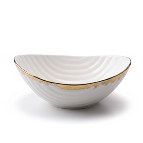 Large oval porcelain serving bowl, white and gold salad bowl, luxury ribbed fruit bowl, oversized porcelain serving dish, modern white ceramic centerpiece bowl, Gold rimmed oval server, fluted porcelain pasta bowl, elegant host serving dish, contemporary white and gold dinnerware, high-end housewarming gift, decorative organic shaped bowl.
