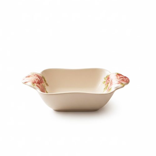BJ-132 Elegant Rose Ceramic Sauce Dish – Rectangular Floral Porcelain Dipping Bowl with Handles – Vintage Style Ramekin for Condiments, Appetizers & Soy Sauce