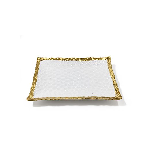 Rectangular porcelain deep tray, hammered white and gold snack dish, gold rimmed appetizer plate, luxury porcelain serving tray, modern white ceramic platter, Gold scalloped edge tray, white and gold home decor, elegant host serving dish, high-end vanity tray, hammered white porcelain platter, decorative deep snack server.