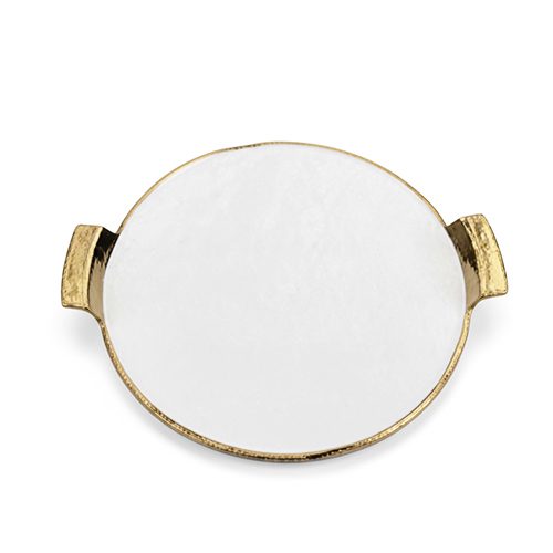 Round porcelain serving tray, white and gold platter, gold rimmed serving dish, luxury porcelain tray with handles, decorative round server, Hammered gold rim platter, integrated handle ceramic tray, elegant vanity display tray, contemporary host serving tray, high-end housewarming gift, minimalist porcelain home decor.