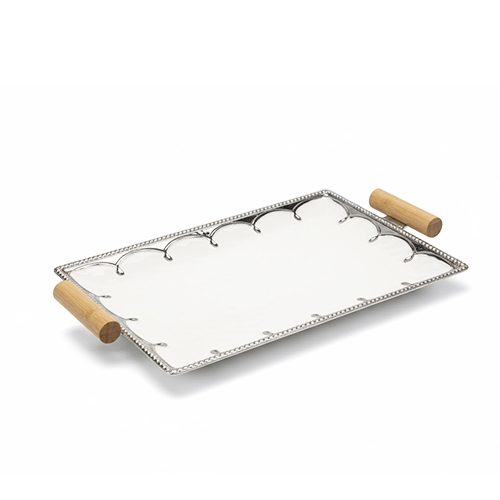 Large rectangular porcelain tray, white serving platter with wood handles, silver beaded serving tray, luxury rectangular appetizer tray, modern porcelain host platter, Silver scalloped rim tray, white and wood serving board, elegant ottoman tray, high-end coffee table platter, porcelain tray with handles, decorative white ceramic platter.