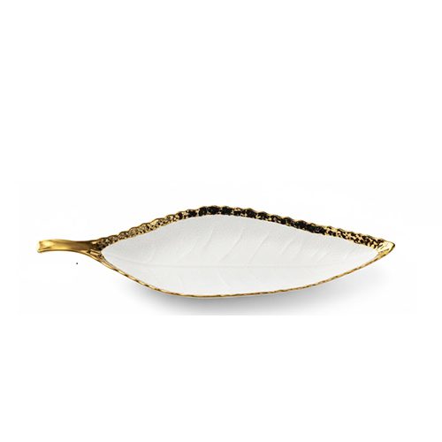 BJ 239 Medium Deep Luxury Leaf-Shaped Porcelain Serving Tray with Gold-Gilded Rim ? Elegant Botanical Decorative Dish for Snacks, Appetizers, and Home Decor