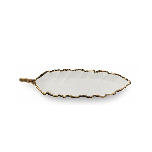 BJ 240 Luxury Deep Leaf-Shaped Porcelain Serving Tray ? Elegant White Botanical Dish with Gold Hammered Rim for Snacks, Jewelry, and Home Decor