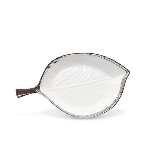 Deep leaf-shaped porcelain tray, botanical serving dish, gold rimmed leaf platter, luxury white porcelain tray, decorative leaf bowl, White and gold snack dish, leaf-shaped appetizer server, nature-inspired home decor, elegant jewelry catch-all, hammered gold porcelain, high-end hostess gift.