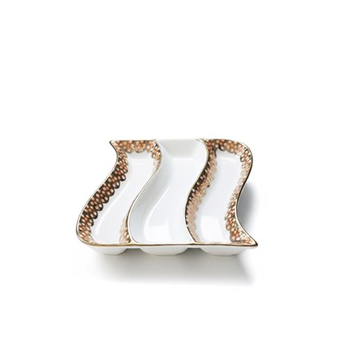 3-section porcelain snack tray, wave-shaped dry fruit dish, gold rimmed condiment server, luxury porcelain appetizer platter, S-curve serving tray, Modern white and gold tableware, textured gold beaded dish, elegant nut and candy tray, unique porcelain centerpiece, contemporary hostess gift, luxury snack organizer.