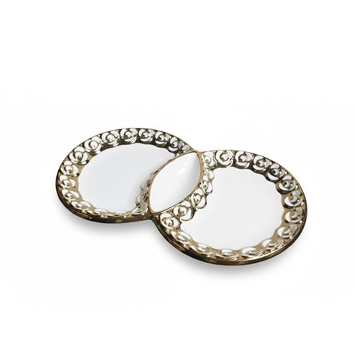 BJ 254 Presto Luxury Dual-Partition Ceramic Serving Tray Elegant White Porcelain Double Platter with Ornate Gold-Plated Latticed Rims