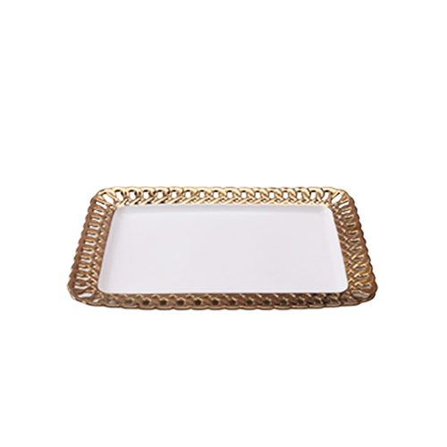 BJ 31 Presto Luxury Medium Rectangular Ceramic Serving Tray Elegant White Porcelain Appetizer Platter with Ornate Gold-Plated Latticed Rim