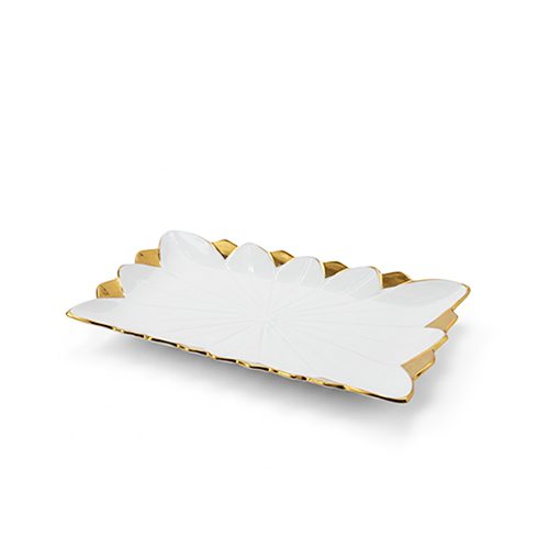 BJ 78 Presto Luxury Rectangular Ceramic Serving Tray Elegant White Porcelain Platter with Gold-Trimmed Scalloped Edges and Radiant Sunburst Texture