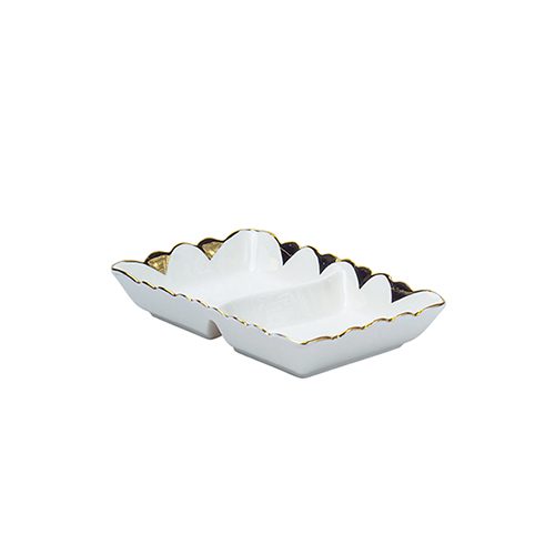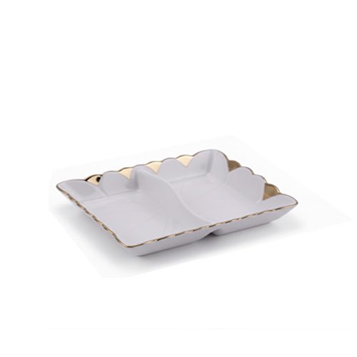 BJ 89 Presto Luxury 2-Section Ceramic Serving Tray Elegant Divided Porcelain Appetizer Dish with Gold Scalloped Edges and Floral Embossing