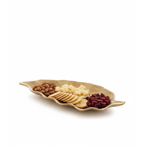 Make a statement with this oversized gold ceramic leaf platter. Its dramatic, elongated shape and detailed veining bring a touch of rustic elegance to any occasion. Use it as a stunning centerpiece for fruit or candles, or as a grand serving tray for large charcuterie spreads and hors d'oeuvres. A truly unique and eye-catching piece of luxury home decor and premium serving ware.