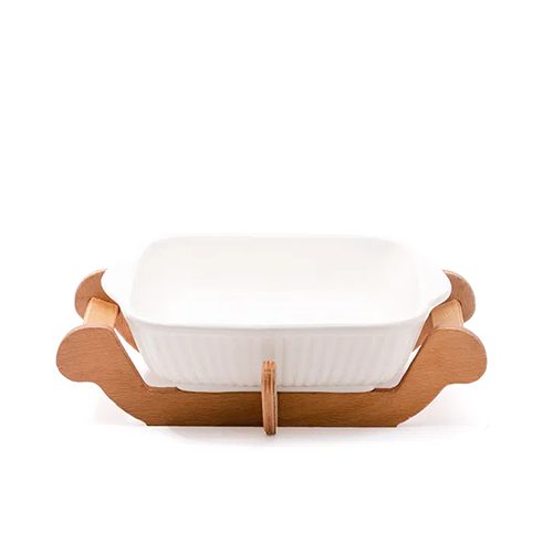 ECR-39 Square Ceramic Baking Dish and Serving Bowl with Detachable Wooden Rocker Stand | Oven-to-Table Presentation