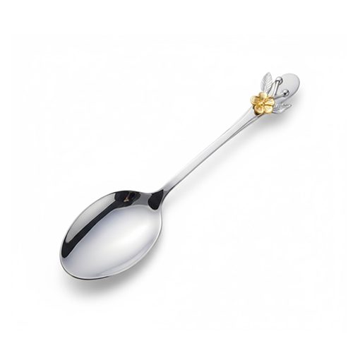 Stainless steel curry spoon with flower motif, decorative silver serving spoon, floral handle buffet spoon, luxury curry server, gold flower motif cutlery, ornate serving utensils, Wedding catering spoons, elegant silver curry server, rust-resistant floral spoon, mirror-polished buffet tools, high-end kitchenware gift, contemporary floral serving utensils.