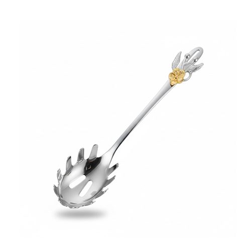 F004-11 Luxury Stainless Steel Spaghetti Server with Gold Flower Motif ? Premium Mirror-Polished Pasta Fork ? Elegant Decorative Noodle Spoon for Weddings & Gourmet Dining