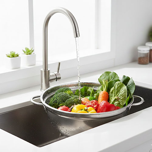 Stable Base/Stand: The integrated base ring ensures the colander remains stable and elevated in the sink, keeping food away from standing water and allowing for maximum drainage.