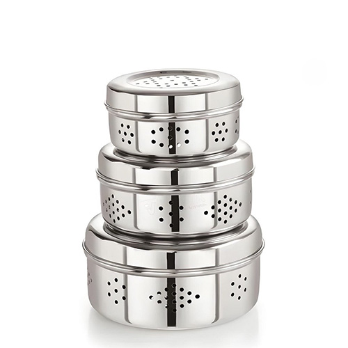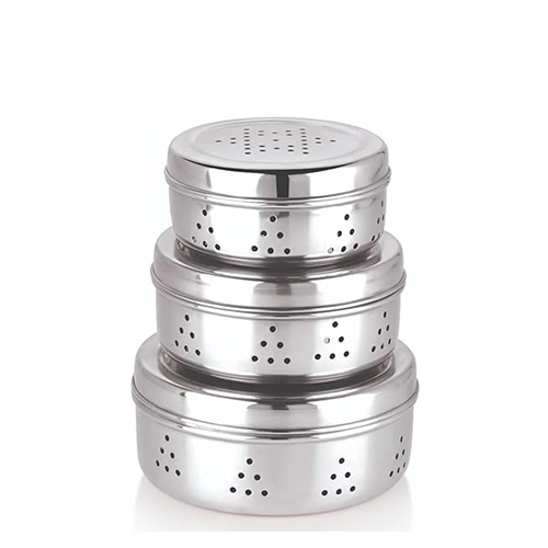 PKW-1236 Stainless Steel Perforated Jali Dabba Set (3 Piece) | Multi-Size Strainer Container & Steamer Basket