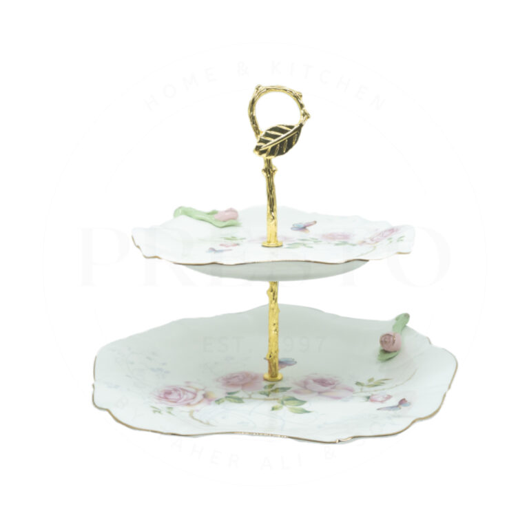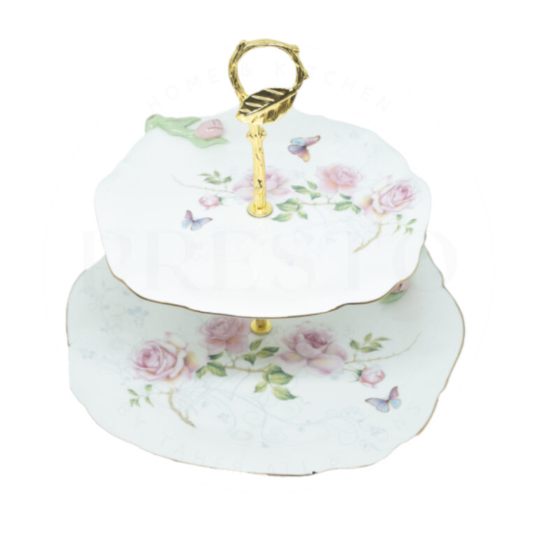 PR-114 Vintage Floral 2-Tier Ceramic Pastry Stand – Elegant Porcelain Dessert Tower with Gold Leaf Handle – Shabby Chic Cupcake & Cake Display for High Tea