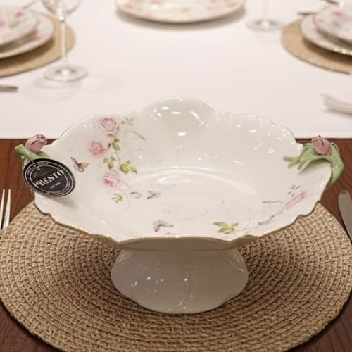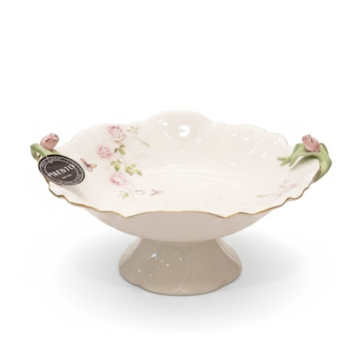 PR-116 Vintage Floral Footed Ceramic Fruit Bowl – Elegant Porcelain Pedestal Serving Dish with 3D Rose Handles – Shabby Chic Centerpiece for Kitchen & Dining Table