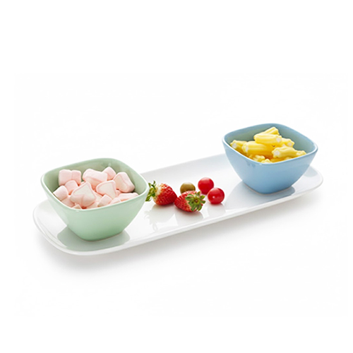 Colorful Dip Bowls: The two separate, deep square bowls are designed to hold dips, sauces, nuts, marshmallows, or side portions (colors like mint green and light blue shown, but check your inventory for exact colors).